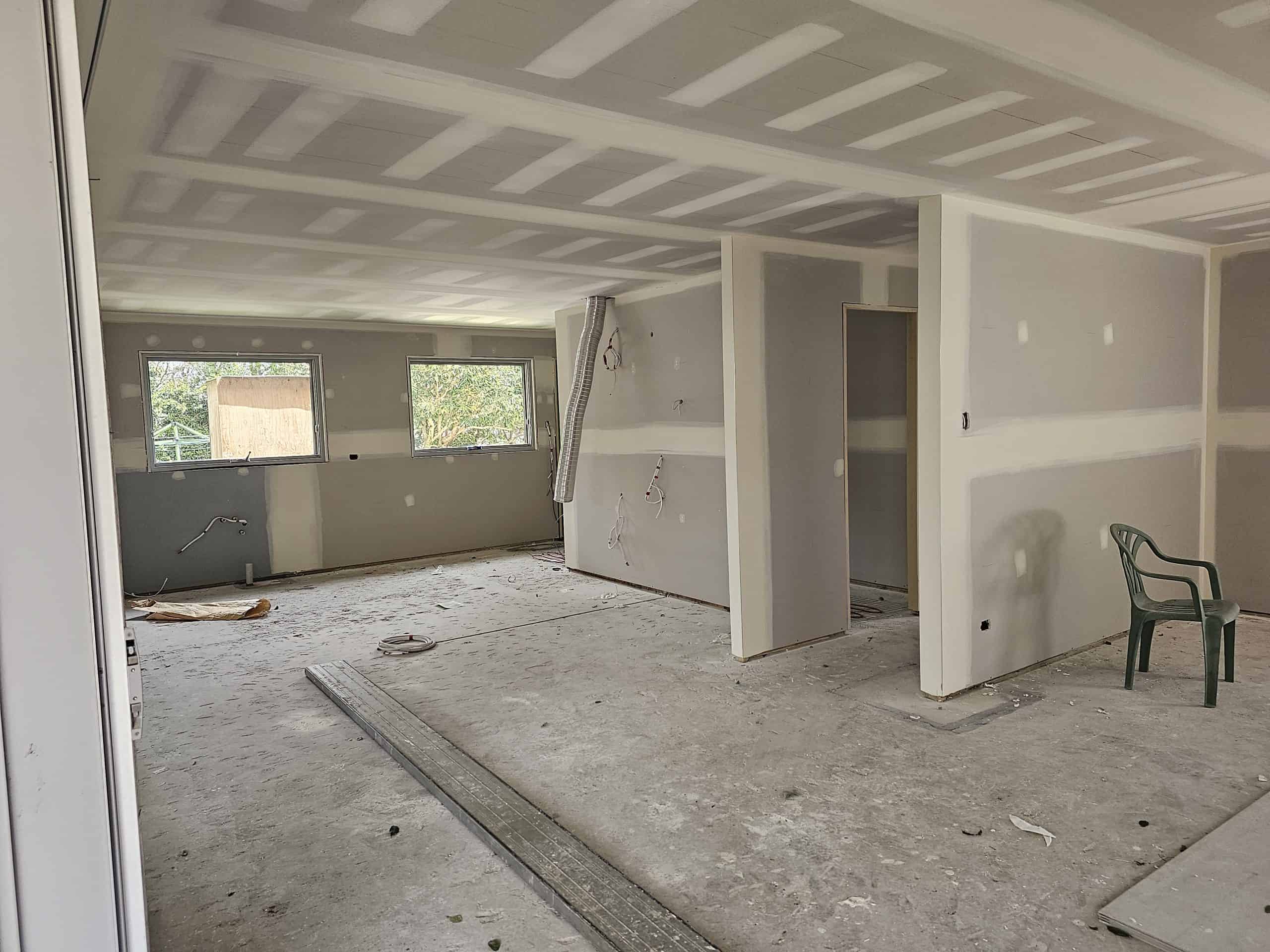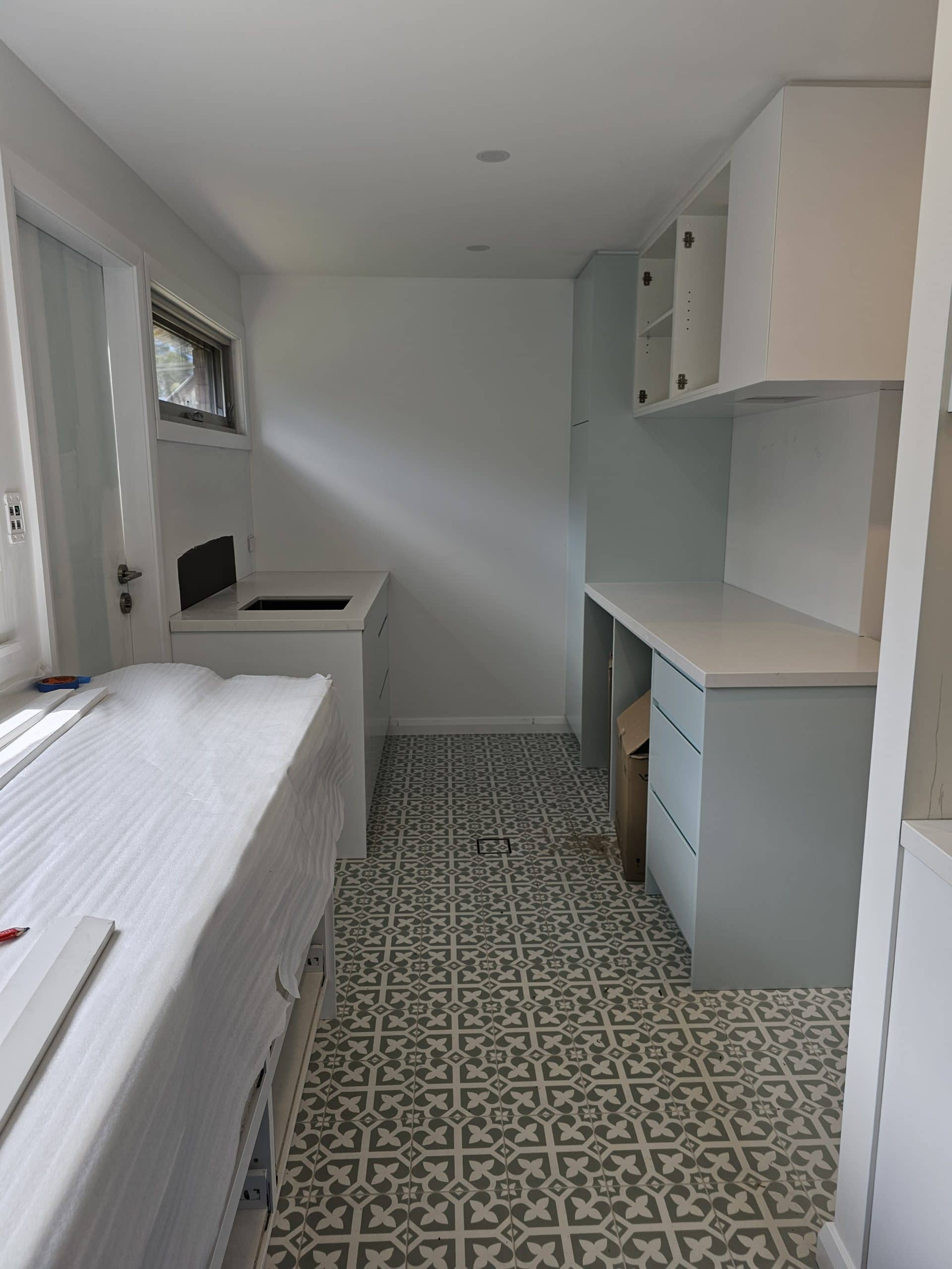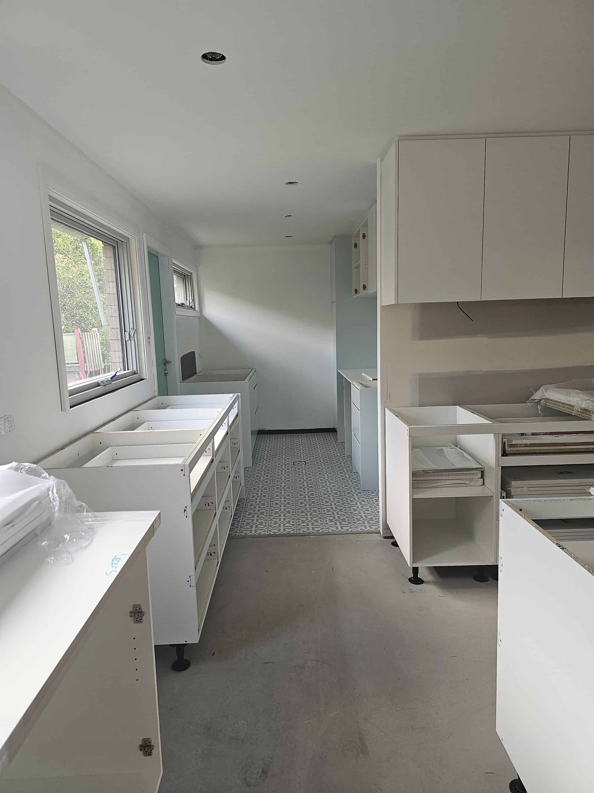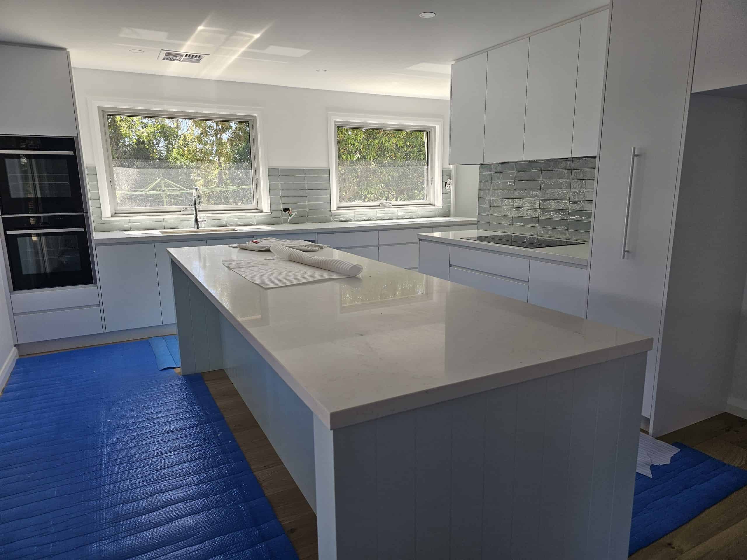 For the kitchen renovation, we demolished the existing kitchen and built the new one, once the flooring had been finished. NSCC laid protective matting over the new floorboards to protect them while the kitchen was being built. The clients chose to have timber floors throughout their kitchen and living area, which provides one consistent look and will make the area appear larger. Within the kitchen, the client chose a Corian benchtop with a kitchen island bench. The kitchen had a double Oven with induction cooktop and subway tiles as their splashback. The cabinetry was polyurethane cabinets with soft closers. There was a mixture of drawers and cupboards