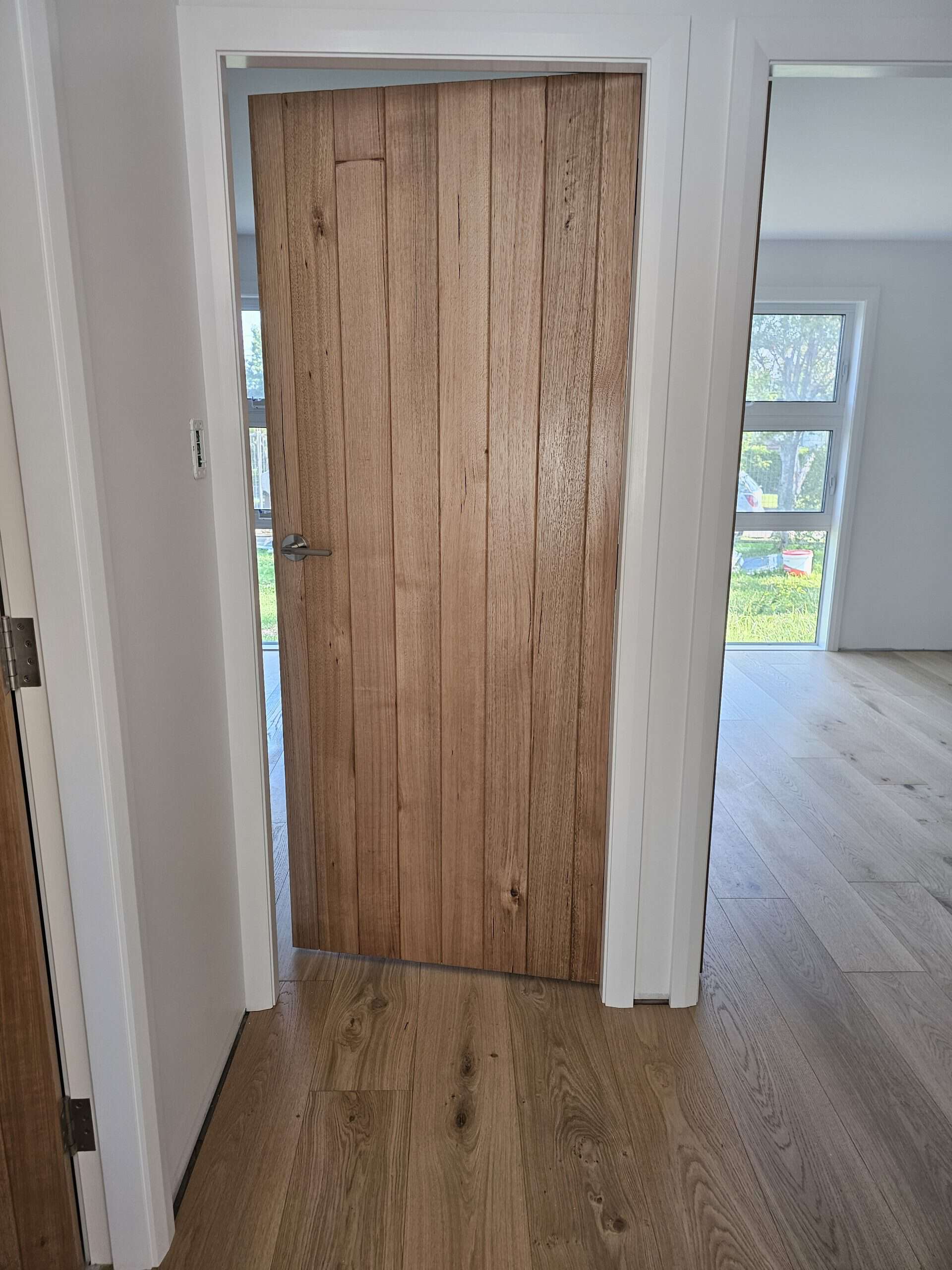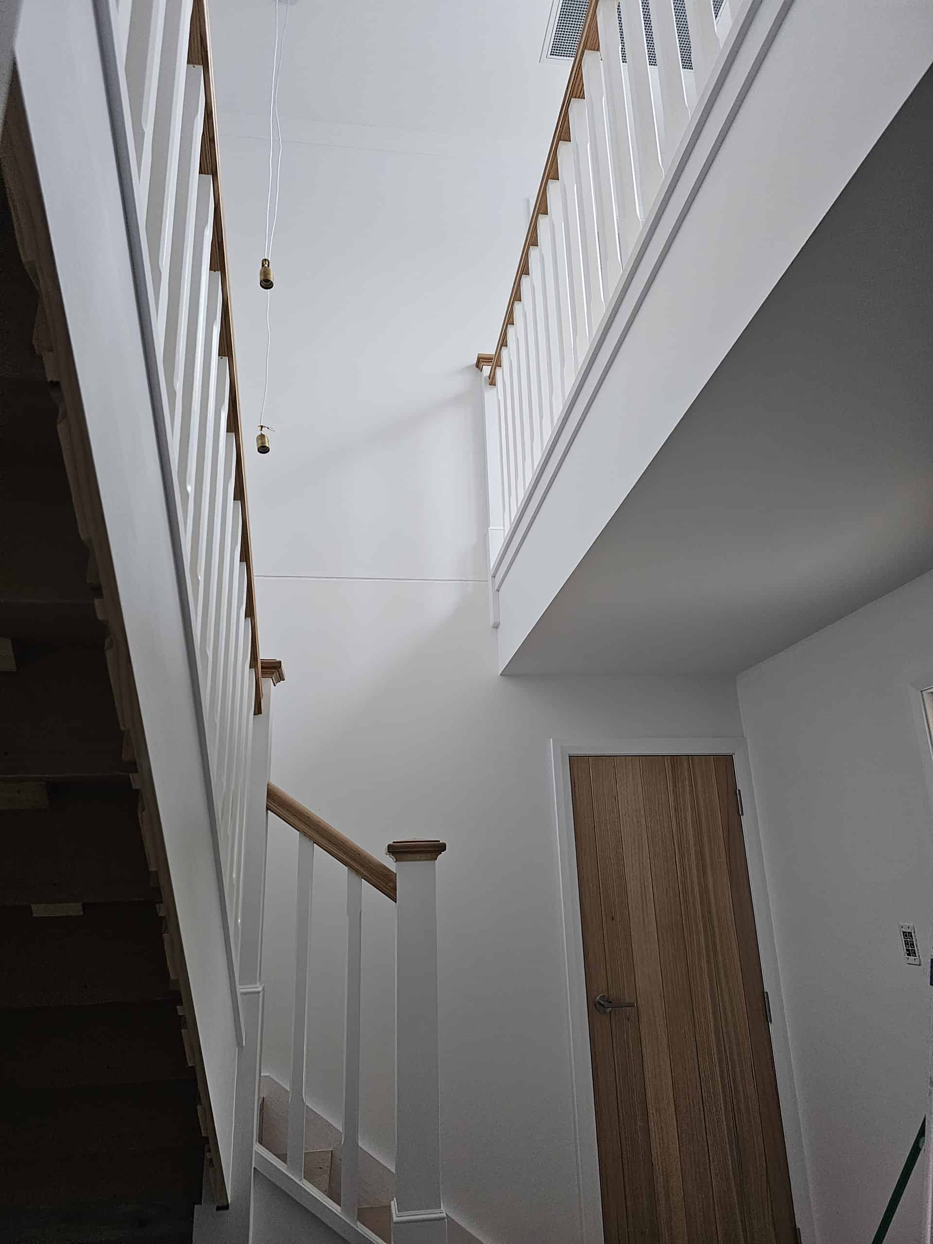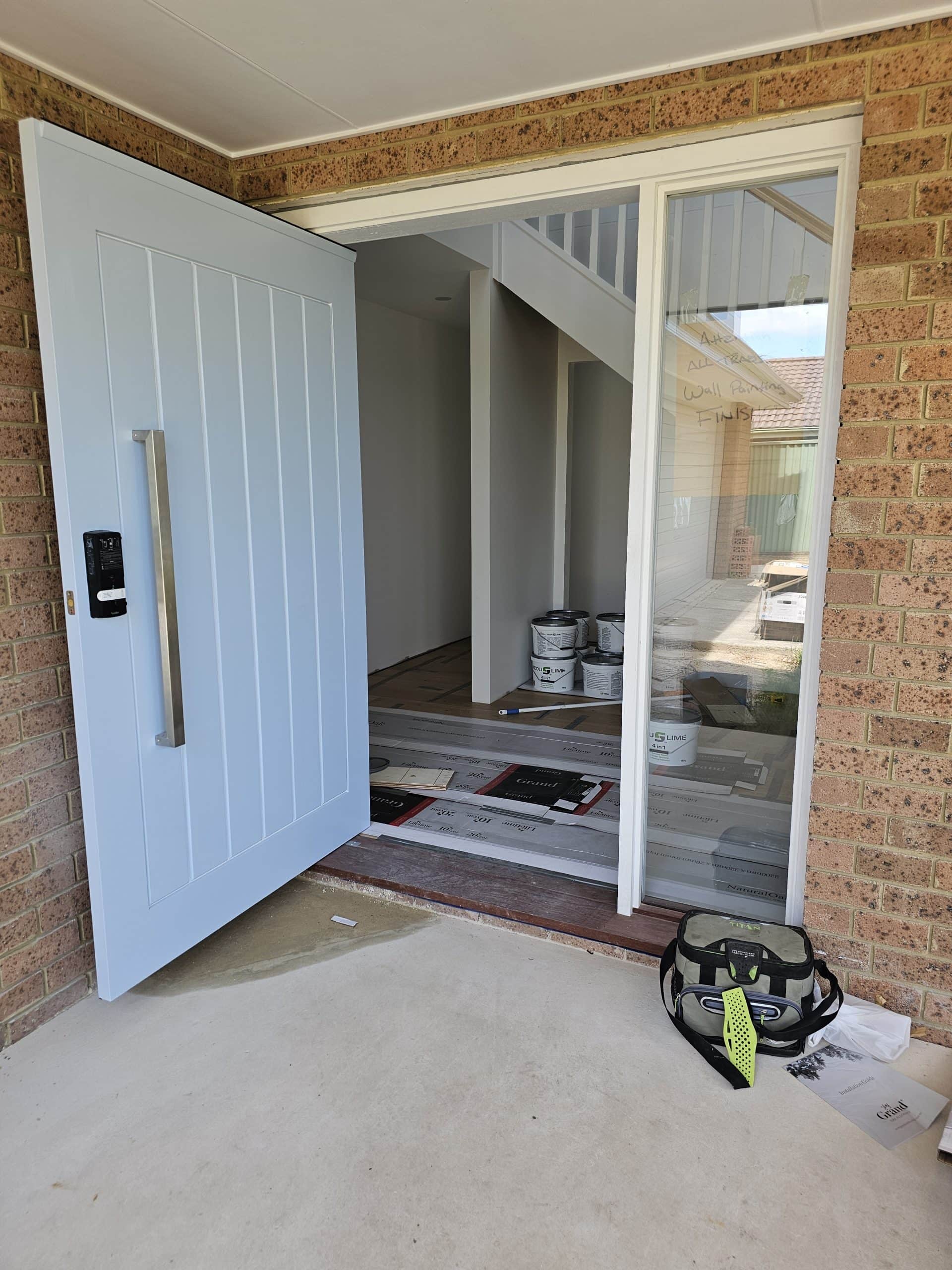 With the staircase in close proximity to the front door, the client chose to put in a new pivot front door, complete with electronic keypad lock. The pivot door opens outwards as per the clients request to enable a larger entrance space.